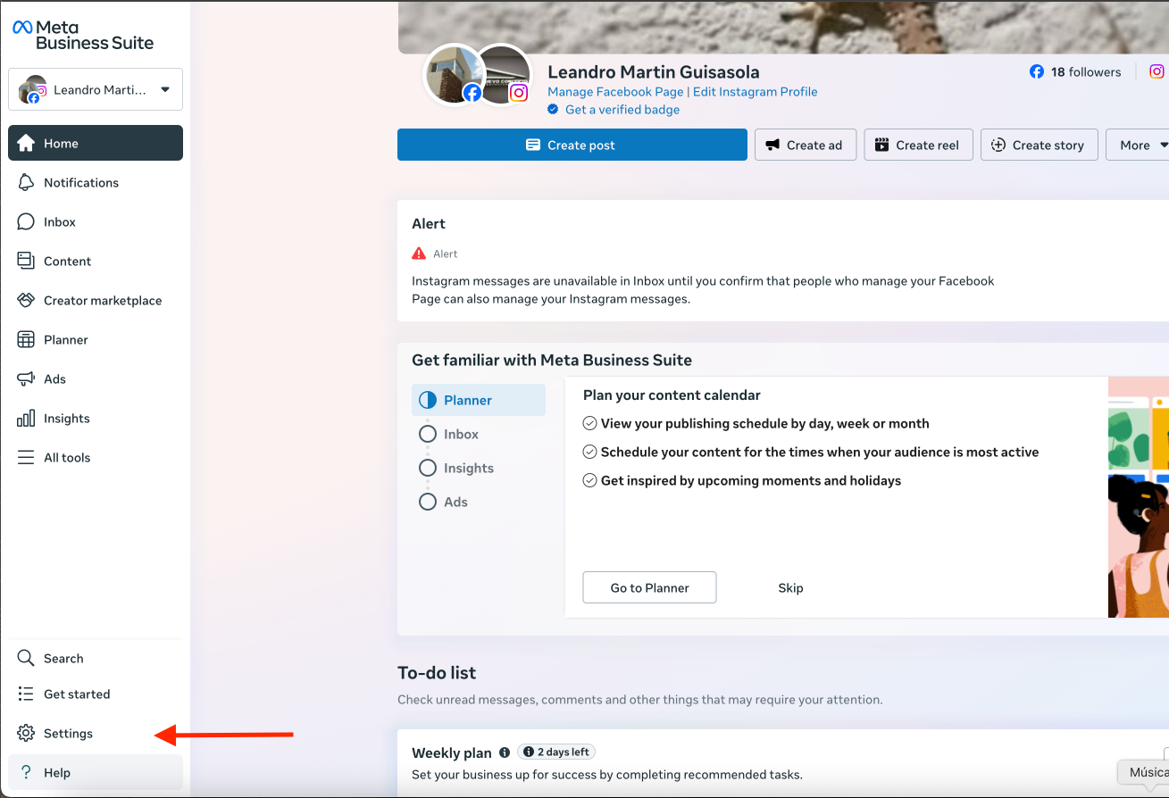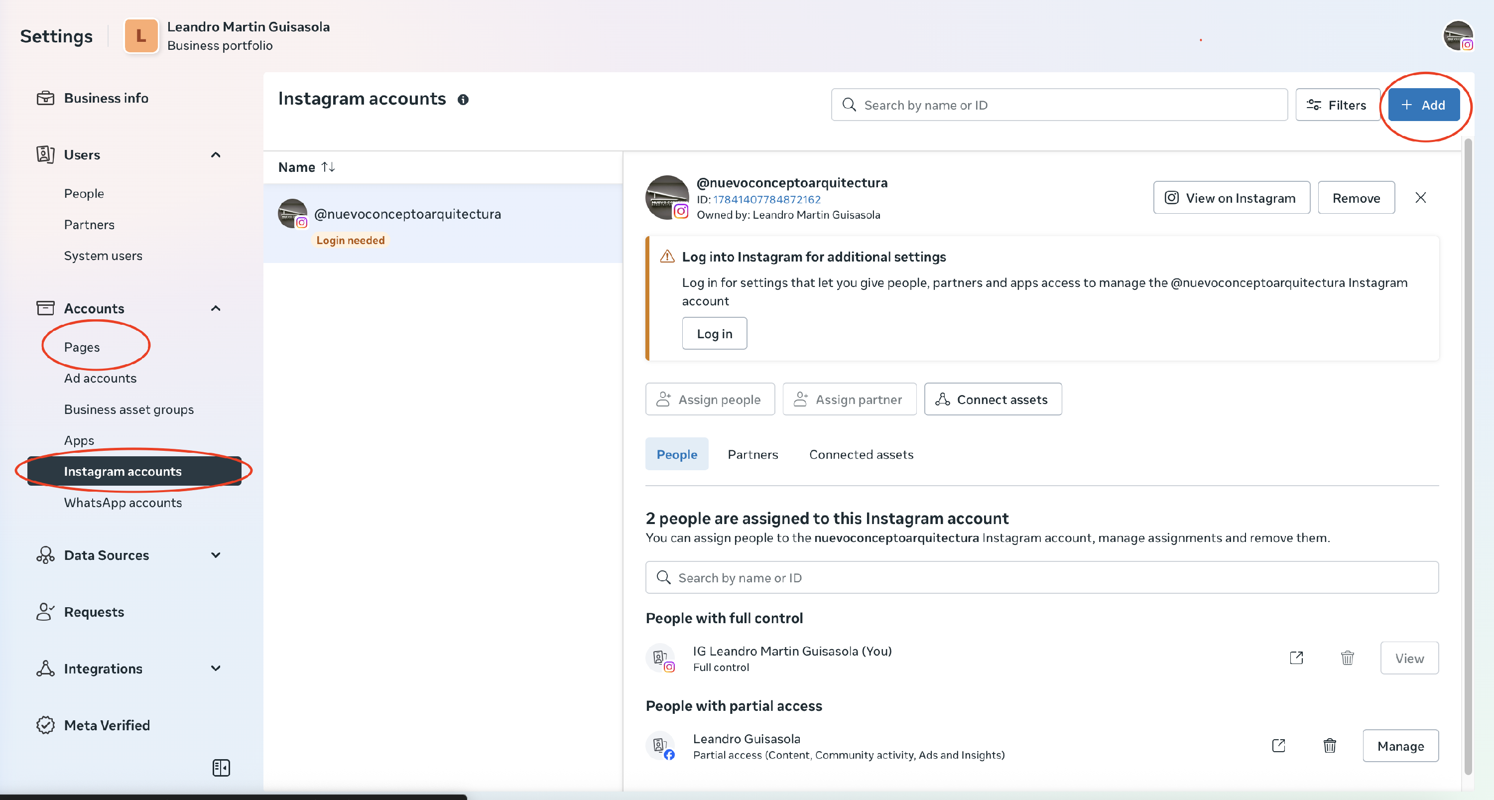 Una vez dentro del portfolio comercial nos tenemos que asegurar que dentro del mismo esten las cuentas de facebook e instagram asociadas, en caso de no estarlo, las agregamos iniciando sesion en las siguientes secciones.