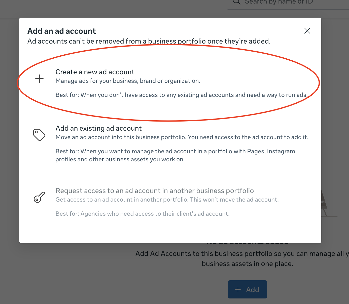 En la sección "ad account" o "Cuentas publicitarias" vamos a ver el siguiente panel, en el caso de ya tener cuenta publicitaria directamente va a aparecer un numero de cuenta, sin embargo en este caso no tenemos, por ende vamos a proceder a crearla.