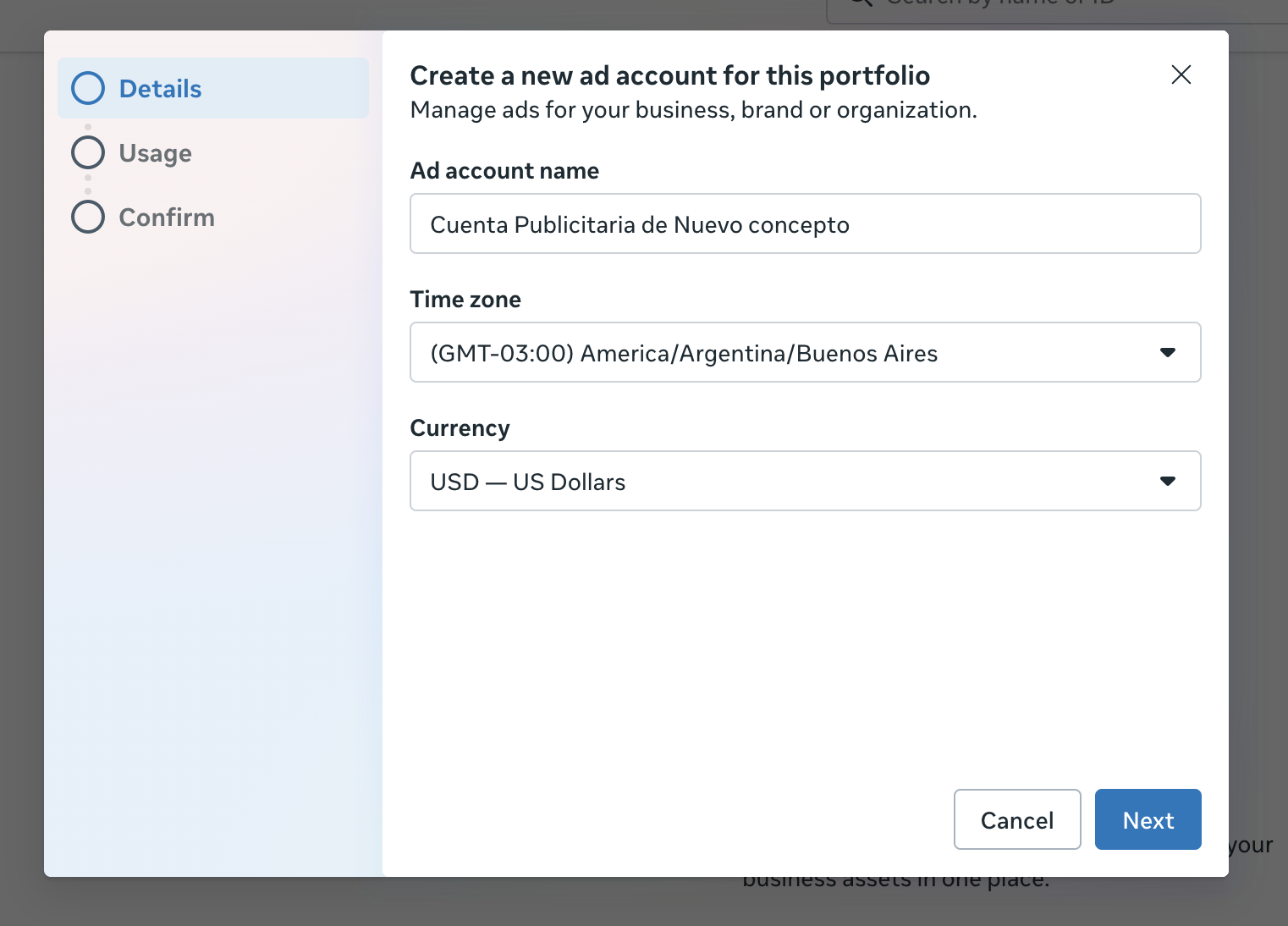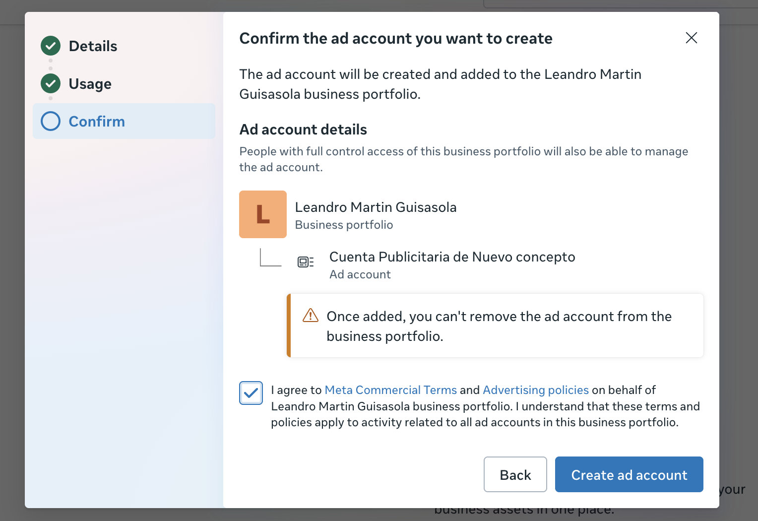 Completamos con el nombre "Cuenta publicitaria de.."