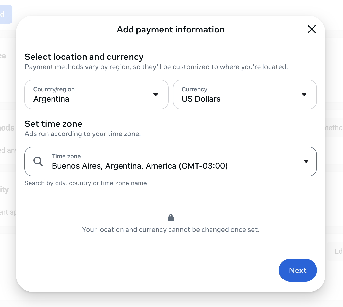 En caso de tener cuenta publicitaria se saltearia este paso, y en caso de no tenerla la creamos de la siguiente manera: