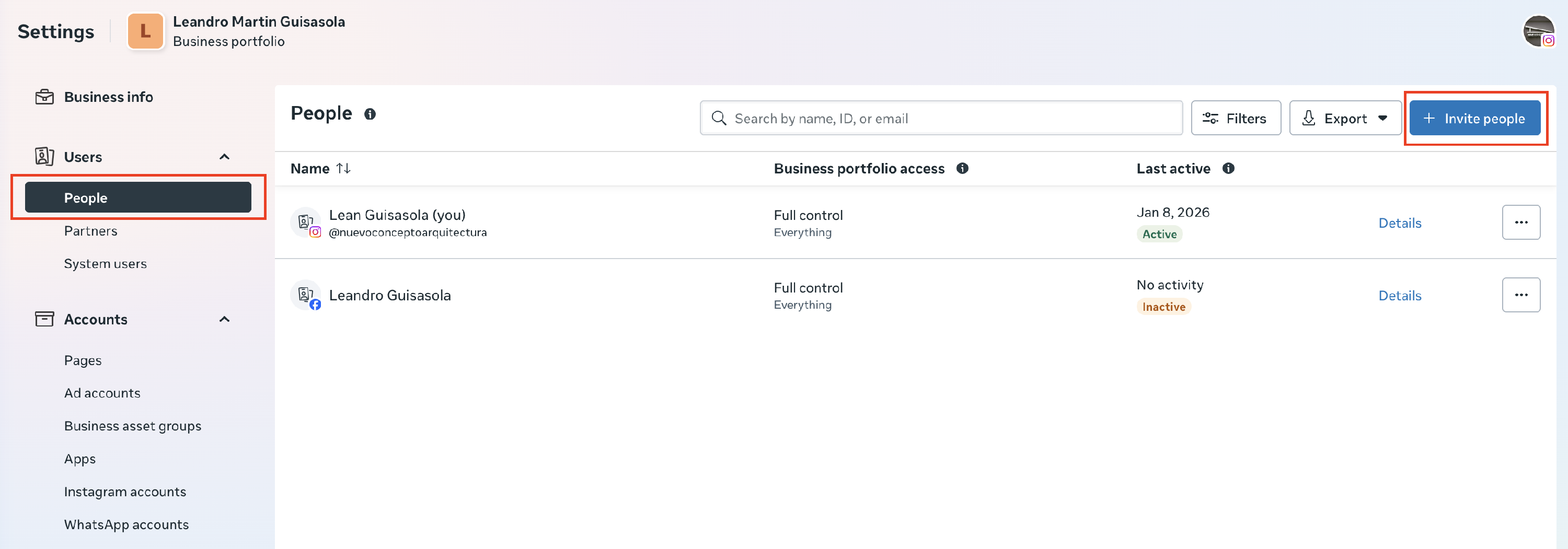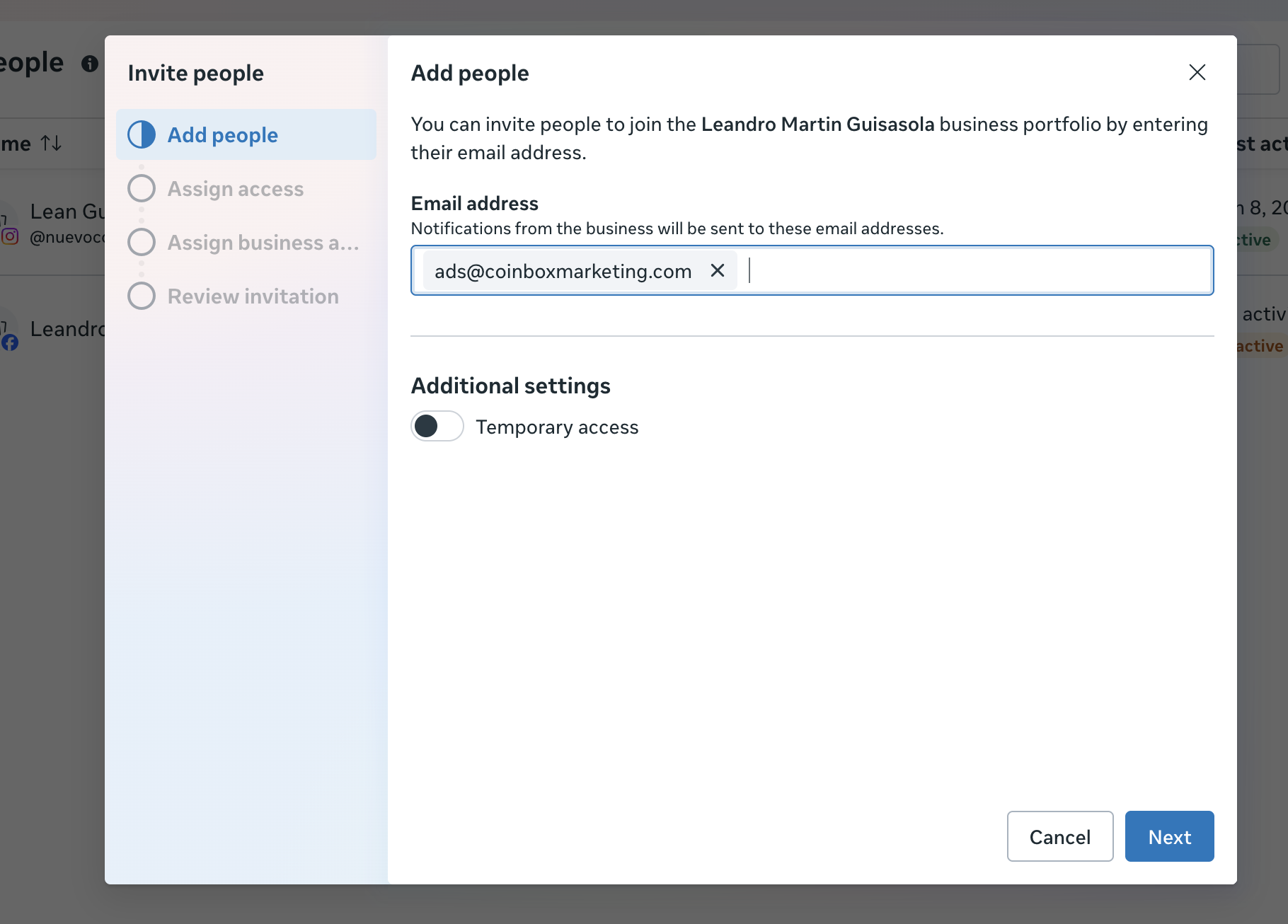 Luego vamos a dar acceso al siguiente mail. ads@coinboxmarketing.com y a un mail de la persona que vaya a conectar el whatsapp en el paso siguiente, asi de esta manera tambien tiene los accesos necesarios para realizar el próximo paso.