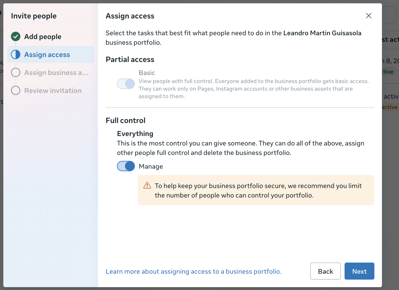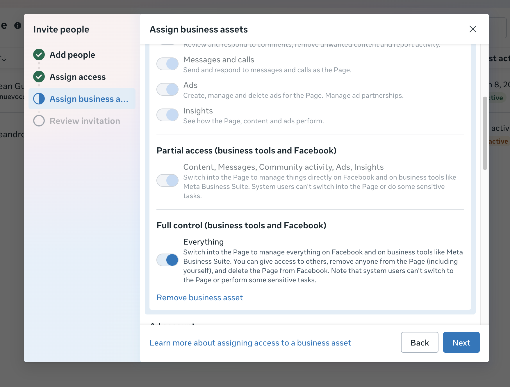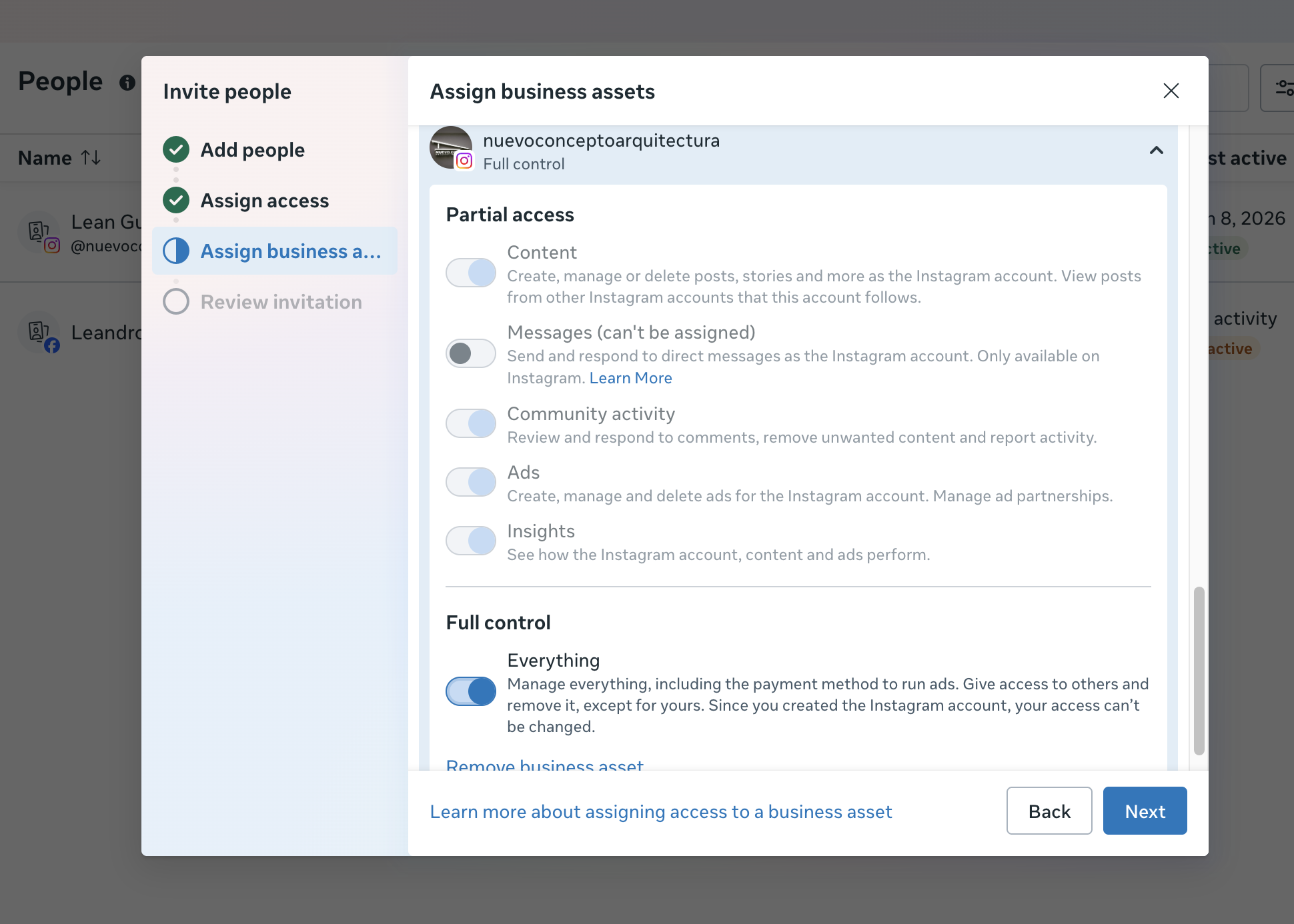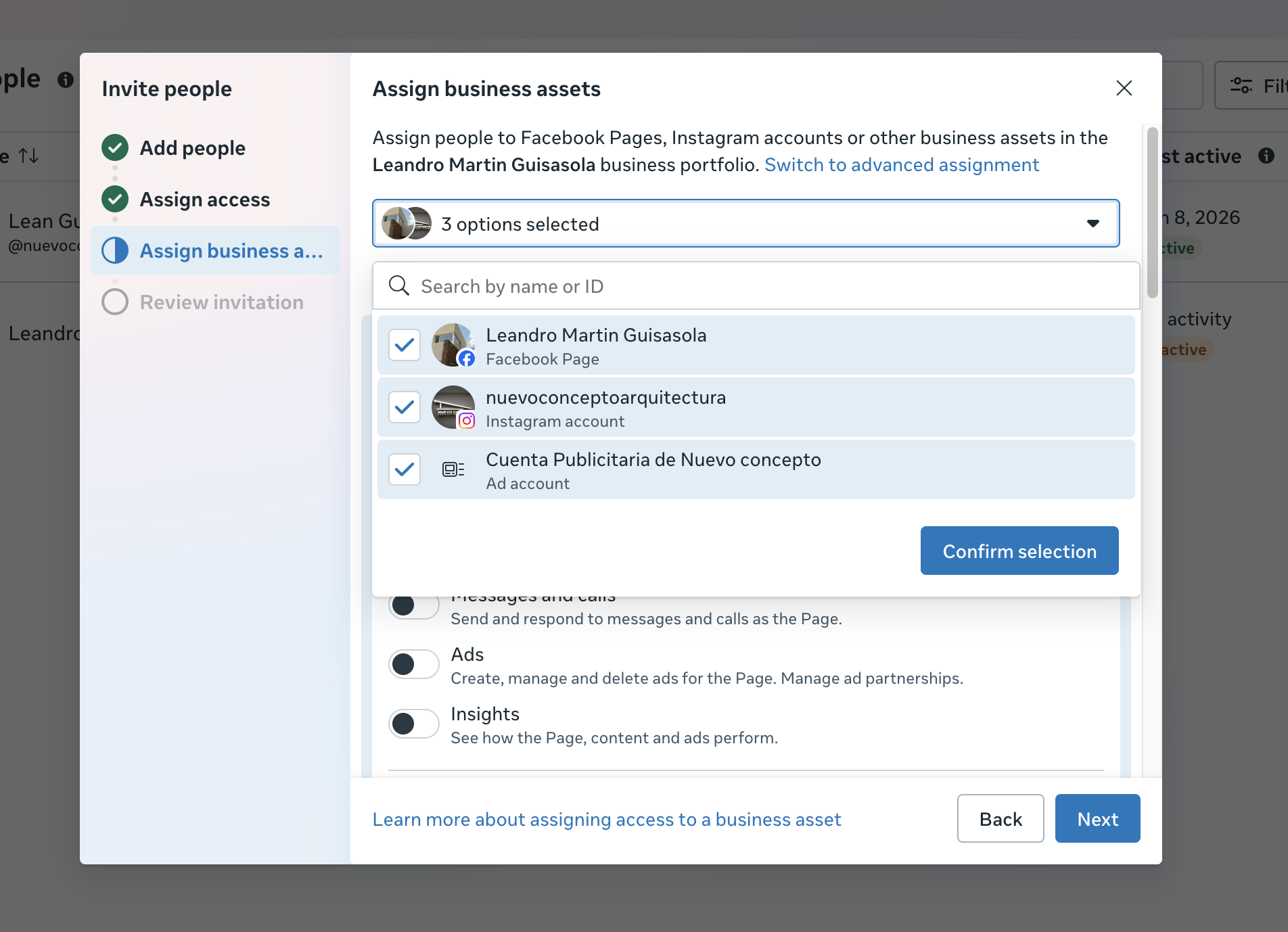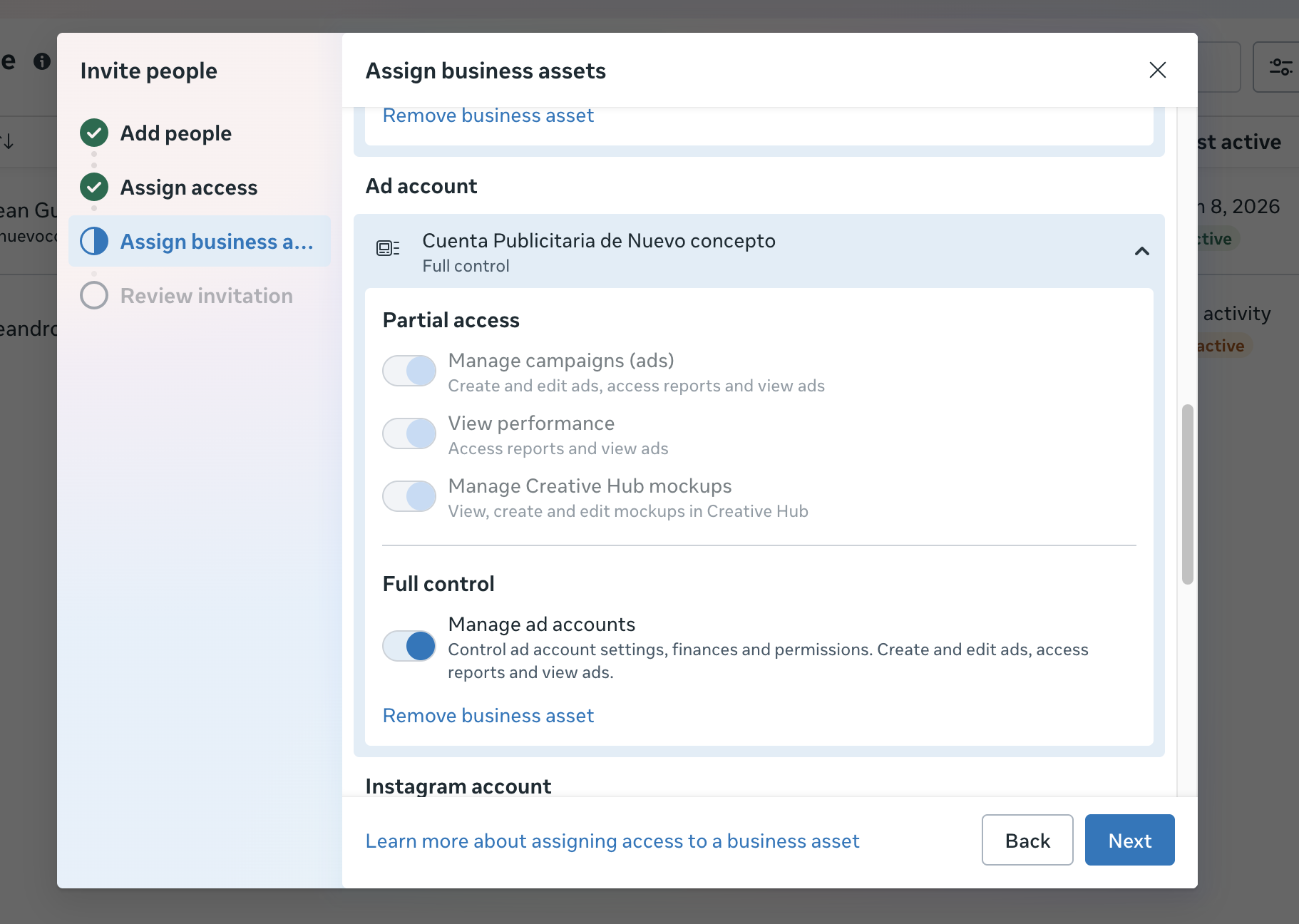 Luego procedemos a dar los accesos, primero seleccionamos todos los activos (pagina de facebook, cuenta publicitaria y pagina de instagram)